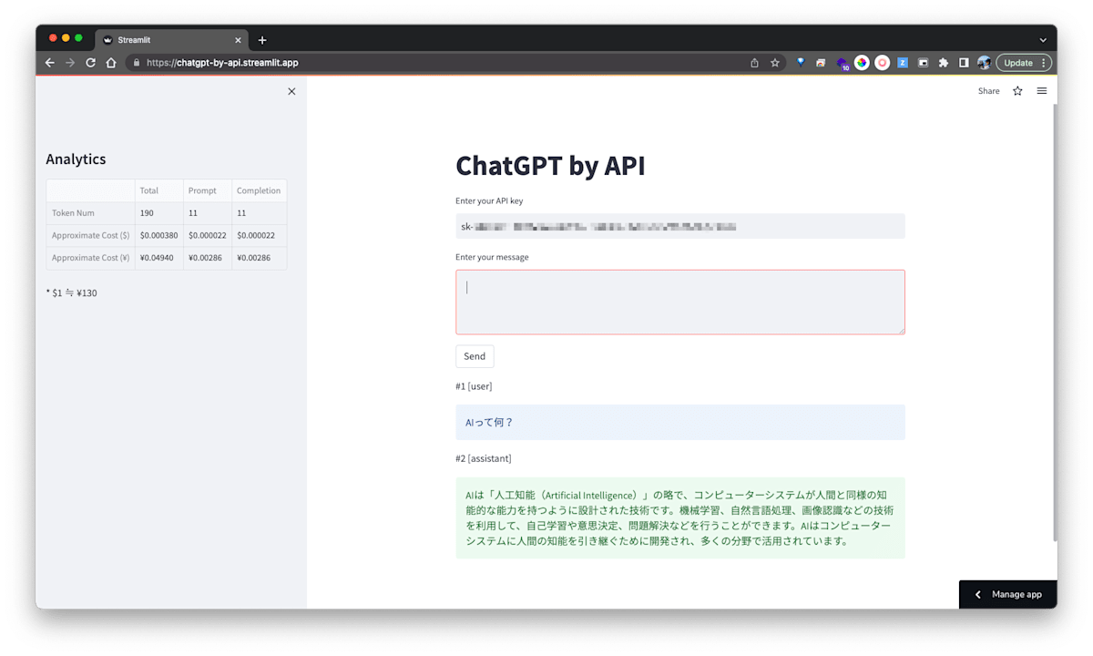 - 左側のサイドメニュー:消費したトークン数と推定料金を表示