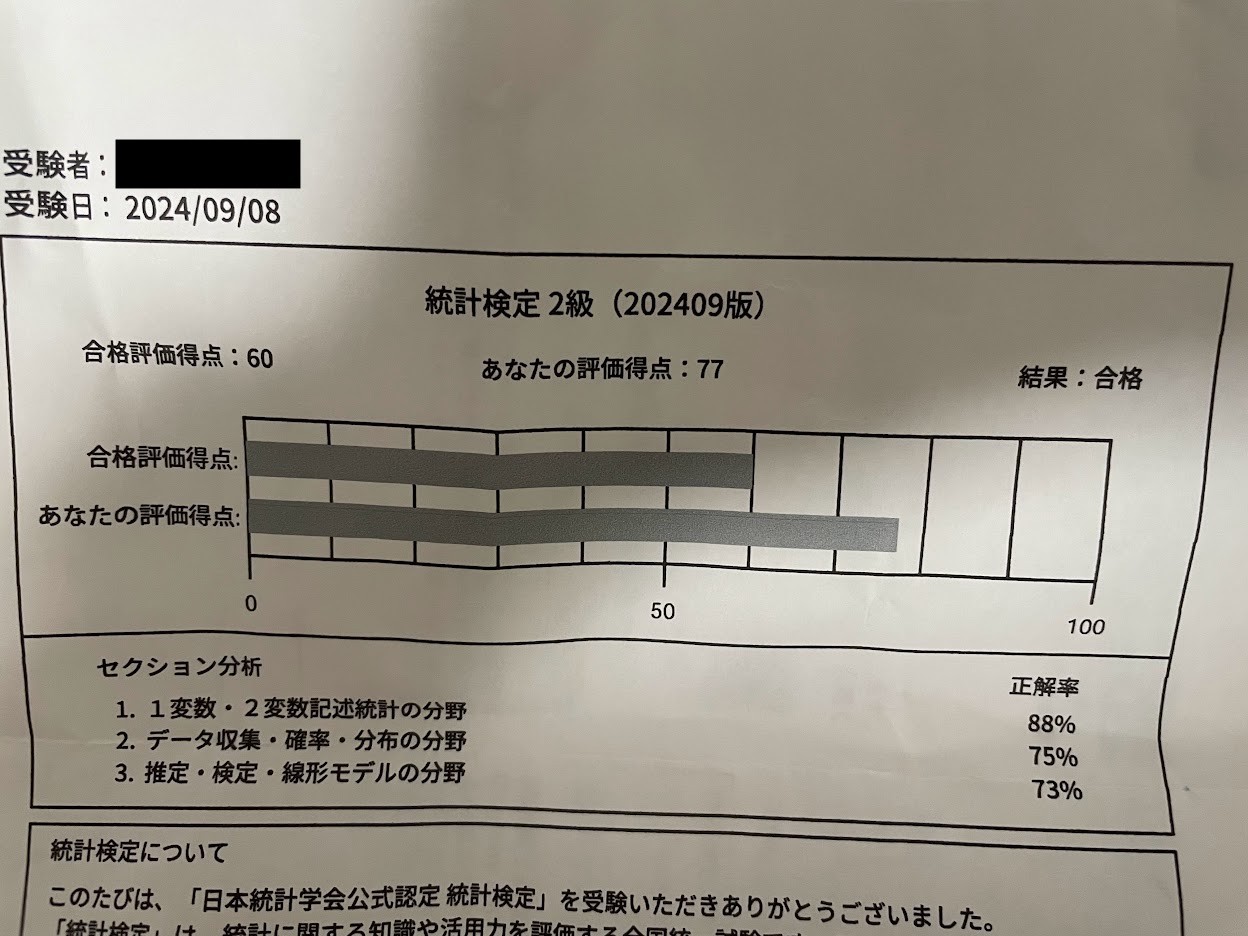 2〜3年Webエンジニアを経験した後は、約6年ほど転職もしながらAIコンサルを経て、2024年9月時点では現在はデータサイエンティストとして働いています。統計検定自体は昔から知っていて興味はあったのですが、そんなに仕事で使うこともないしいいかと思って放置していました。ただ、ところどころ上司がt検定がどうのこうのと言っていたり、1σ、2σがなんたらとかいう会話があったりして、あ、これ自分が知識不足で会話についていけないやという場面が何度かあったので勉強して資格を取っておくのも良いかなと思い今回資格試験を受けることにしました。