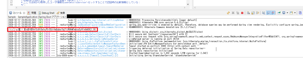 そしてここでDBに登録するはずのパスワード候補の「1234」のハッシュ化後の数値が表示されているか確認します。(確認してDBへの登録が済みましたらこの部分のコードは消してしまっていいと思います。)