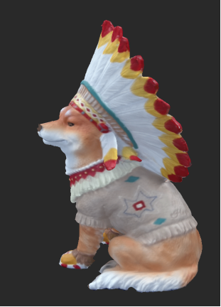 この犬の彫刻のデザインは非常に創造的で、複雑な幾何学的形状と鮮やかな色彩を特徴としています。犬のヘッドドレスは赤、黄、白の羽根が交互に組み合わされ、衣服には繊細な民族的パターンが施されています。全体として、色とディテールが豊かで魅力的な作品です。彫刻の表面には繊細な毛の質感があり、羽根の層が多層的に並べられています。このような特徴により、スキャン作業は非常に難易度が高いものとなりました。彫刻は小さなサイズですが、細部にわたる精緻さが求められ、スキャン機器には非常に高い解像度が必要でした。
