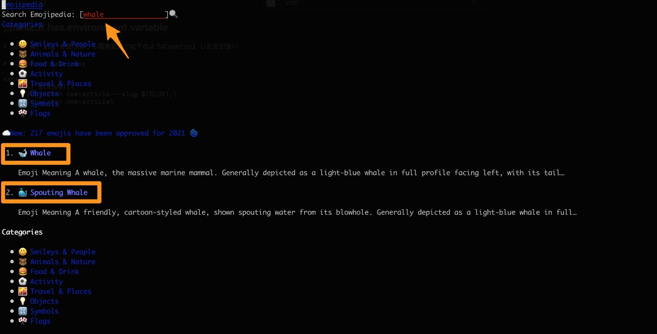 記事を書く際に emoji が必要なので、それがterminalでもさくっと探せるようになります。
