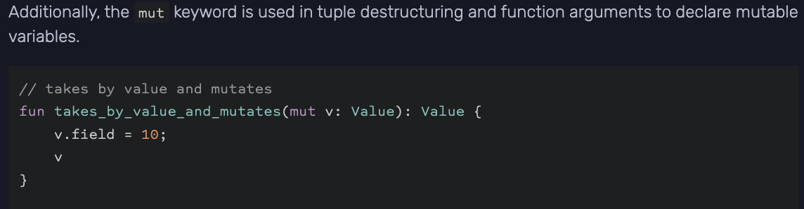 mutキーワードはタプルのデストラクチャリングや関数の引数で、ミュータブル変数を宣言するために使われます。