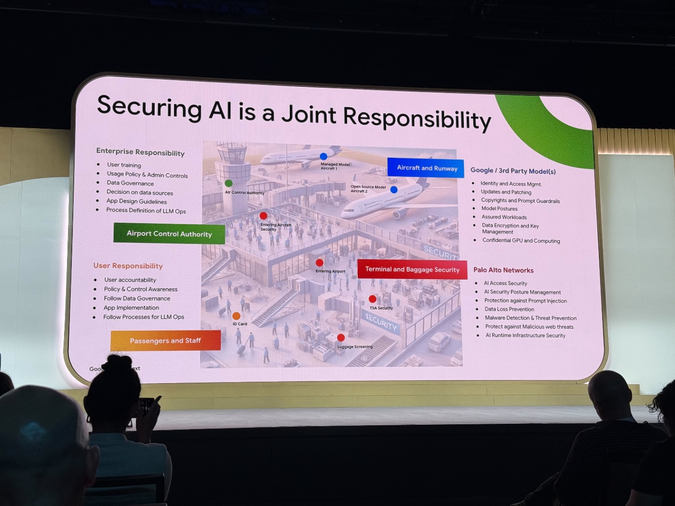Palo Alto Networks社が空港における航空管制官・旅客・航空会社・保安検査といった役割を、生成AIワークロードにおける企業、ユーザー、モデル提供者、セキュリティパートナーになぞらえ、それぞれが担うべき責任範囲を明確に示していました。