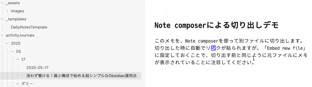 Obsidianでは、より小さなメモに切り出すのに Note composer という機能が提供されており、これを利用すると「選択した部分のメモ」を 別ファイルに切り出してリンクしておくことが簡単にできます。
