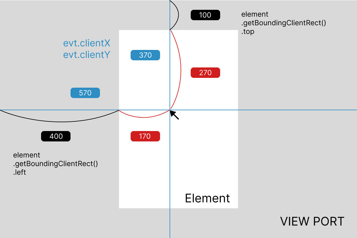 マウス座標はウィンドウのビューポートを基準にしているため「要素の中のどの位置か」を取得するには、要素がウィンドウのどの位置にあるのかを取得する必要がある。