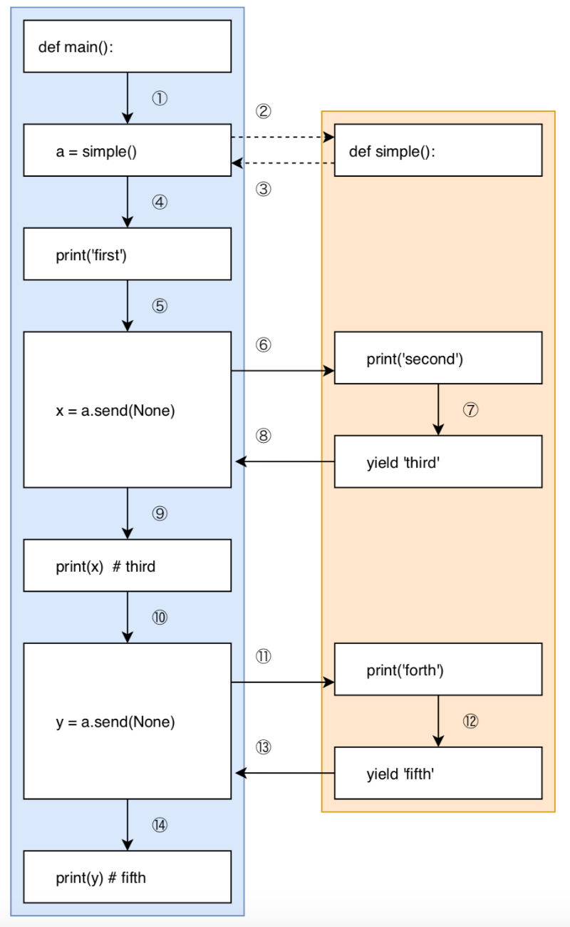 まず、generatorの変わった特徴として、simple()のように呼び出しをしても、そのタイミングでは後続の処理が行われないという事があります。simple()は処理を行うのではなくて、処理を順番に行うための「generator object」を返します。このgenerator objectに対してsend()というメソッドが定義されているので、send()を繰り返すことによって実際の処理を行う、という流れになっています。単純な関数呼び出しとは異なり、呼び出し元のルーチンと呼び出し先のsimple()というルーチンを行ったり来たりしていることになります。