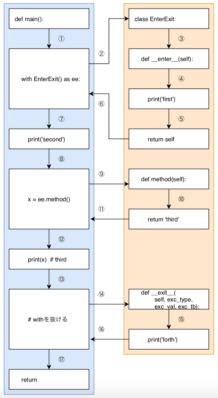 Pythonでは、withを用いたコードブロックにおいては、その先頭で必ず__enter__()