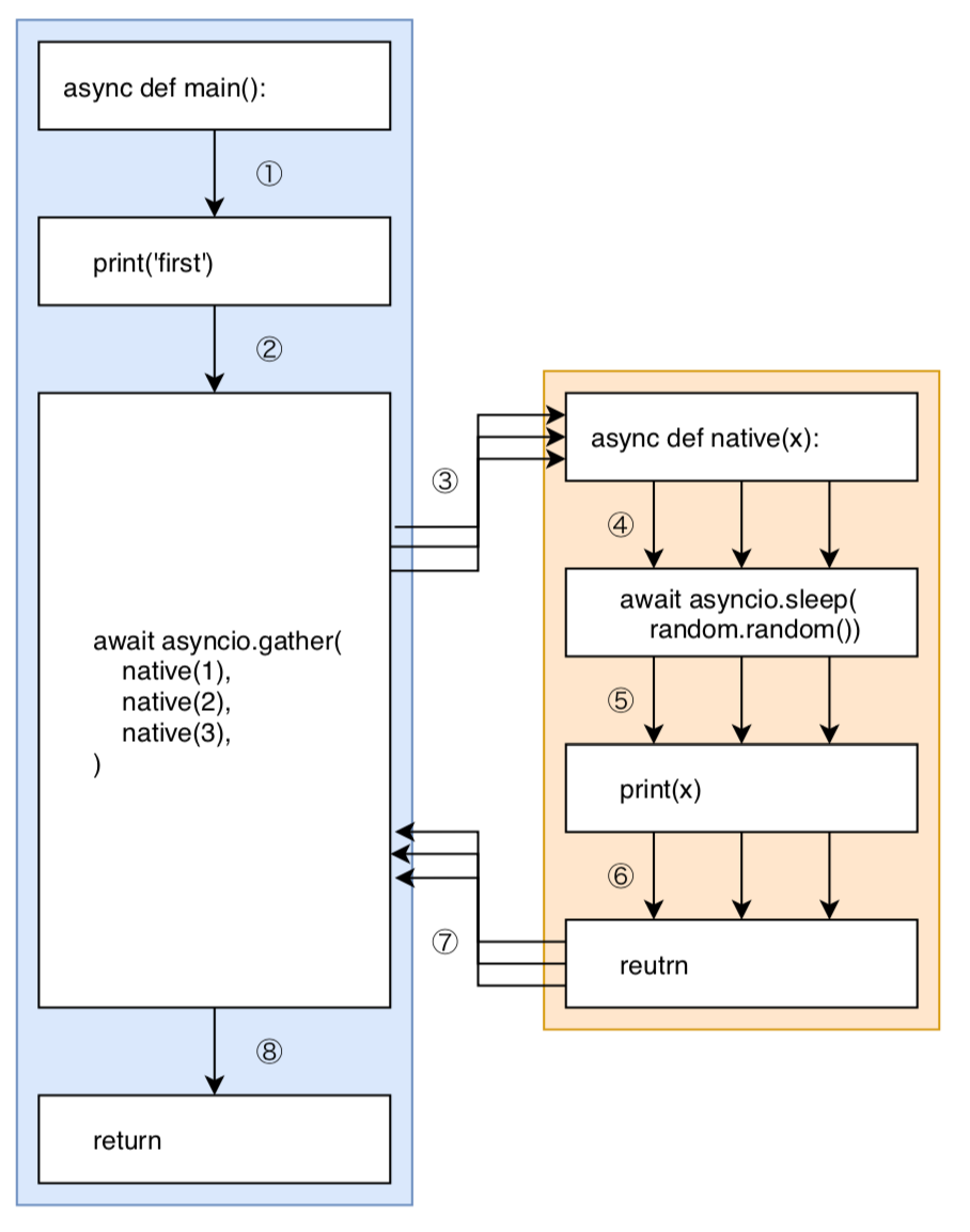 実は、await asyncio.gather()をすると、その引数のnative coroutine達の処理が終了するか、またはタイムアウトするまで待ち続けてしまう ので、コルーチンにおける行ったり来たりという処理ができないのです。ですが、Pythonではこれを(native) coroutineと呼んでいます。