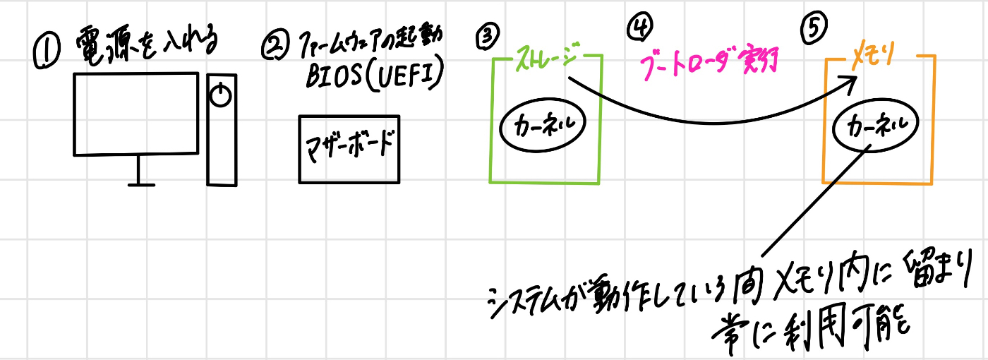 🐈ブートローダ(boot loader)2025/10/27に公開初心者techブートローダによって、カーネルがコンピュータのストレージからメモリにロードされる。 それによりカーネルがメモリに留まり常に利用可能な状態となる 参考 https://wa3.i-3-i.info/word15558.html Discussion
