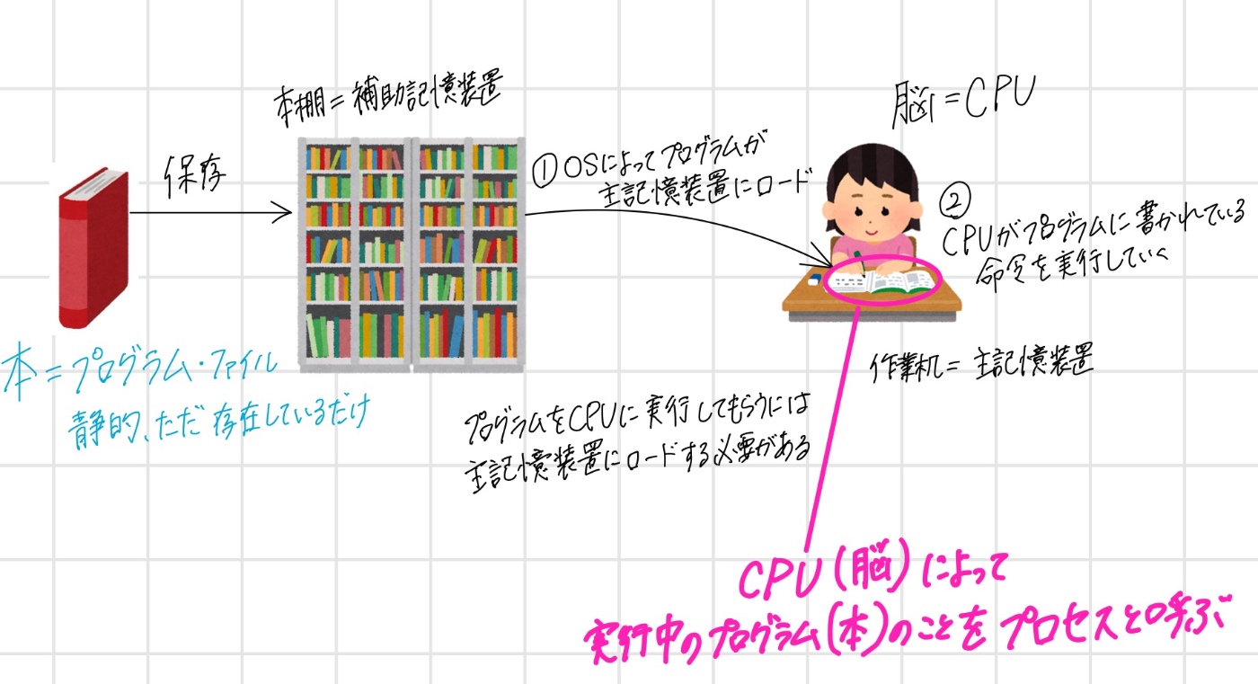 - 補助記憶装置(本棚)に保管してあるプログラム(本)を主記憶装置(作業机)に持ってくる