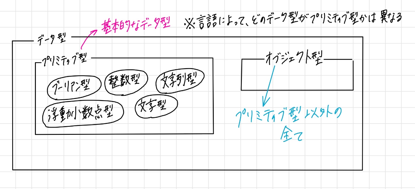 📖プリミティブ型とオブジェクト型2024/09/06に公開2025/04/06データ型オブジェクト型プリミティブ型techデータ型にはプリミティブ型とオブジェクト型がある。 プリミティブ型 基本的なデータ型のこと ※言語によって、どのデータ型がプリミティブ型とされるかは異なる ブーリアン型 整数型 浮動小数点数型 文字型 文字列型など オブジェクト型 プリミティブ型以外全て 参考 https://developer.mozilla.org/ja/docs/Glossary/Primitive Discussion