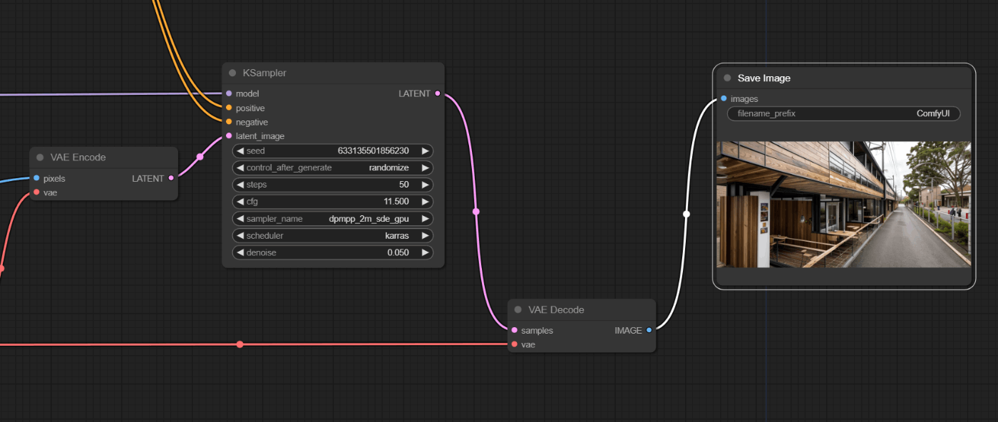 画像を生成します。基となる画像はVAE Encodeで潜在表現にして入力します。生成で出力されるのも潜在表現なので、VAE Decodeで画像に復元します。