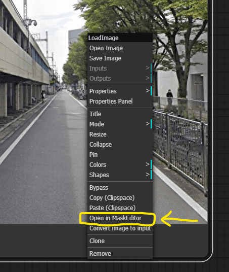 画像をセットしたらLoad Imageノードを右クリックし、Open in MaskEditorでエディタを開きます(Google Colabだと少し時間かかるかも)。