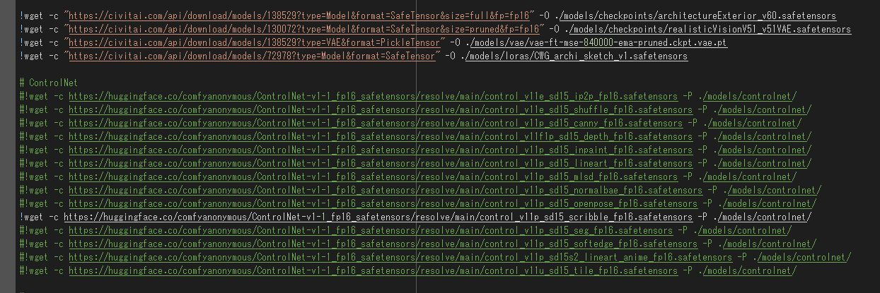 ControlNetのScribbleモデルもダウンロードしちゃいましょう。下記のようにコメントアウトを消すだけです。