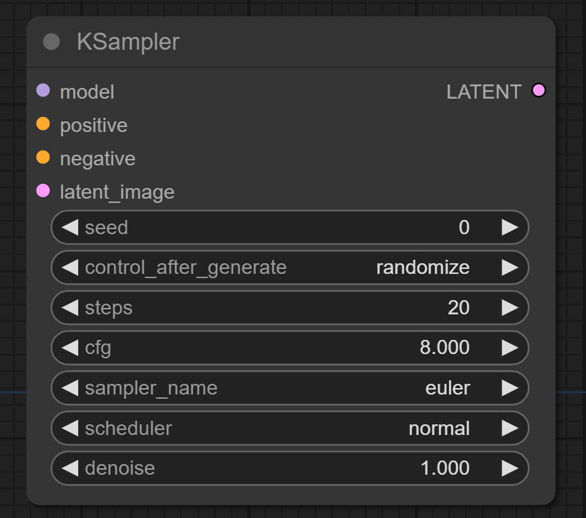 ComfyUIでは画像生成するときに必ずこのKSamplerノードを使うことになるのですが、このノードは上記でいうU-Netの役割を担っています。各パラメータの役割は以下の通りになっています。