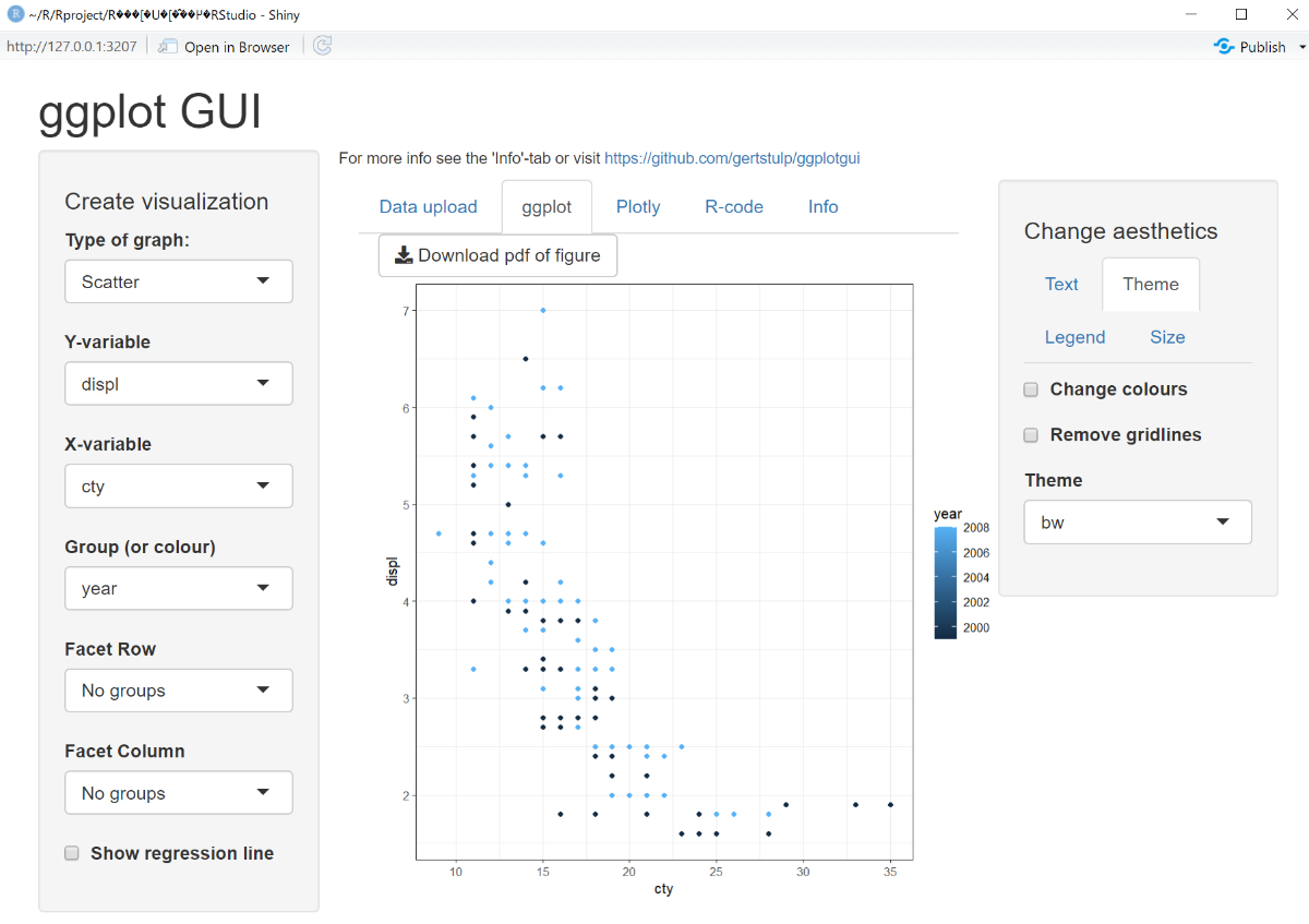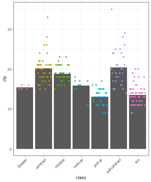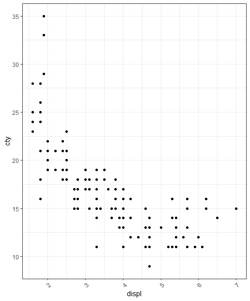 g1 <- ggplot(data = mpg,mapping = aes(x = displ,y = cty)) +