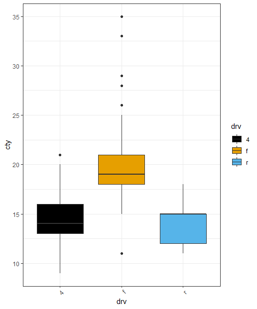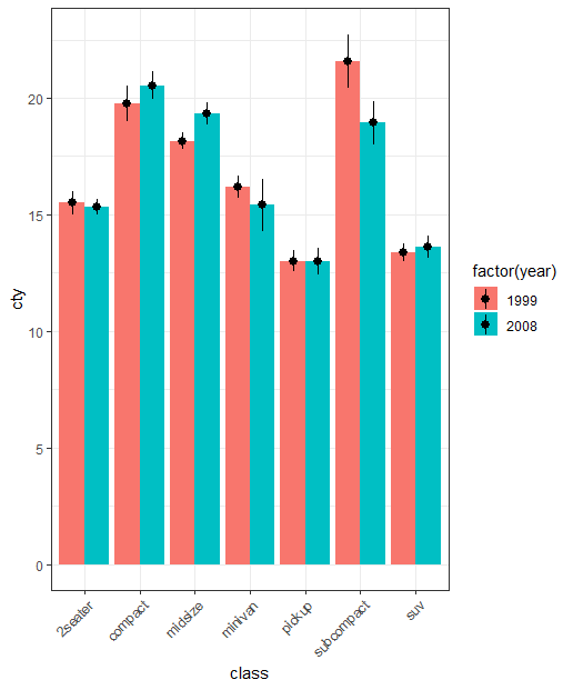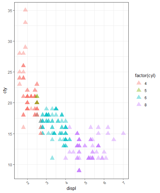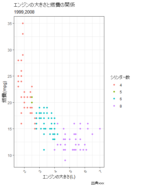 labs(title = 'エンジンの大きさと燃費の関係',subtitle = "1999,2008",caption = '出典xxx',x = 'エンジンの大きさ(L)',y = '燃費(mpg)',colour = 'シリンダー数')