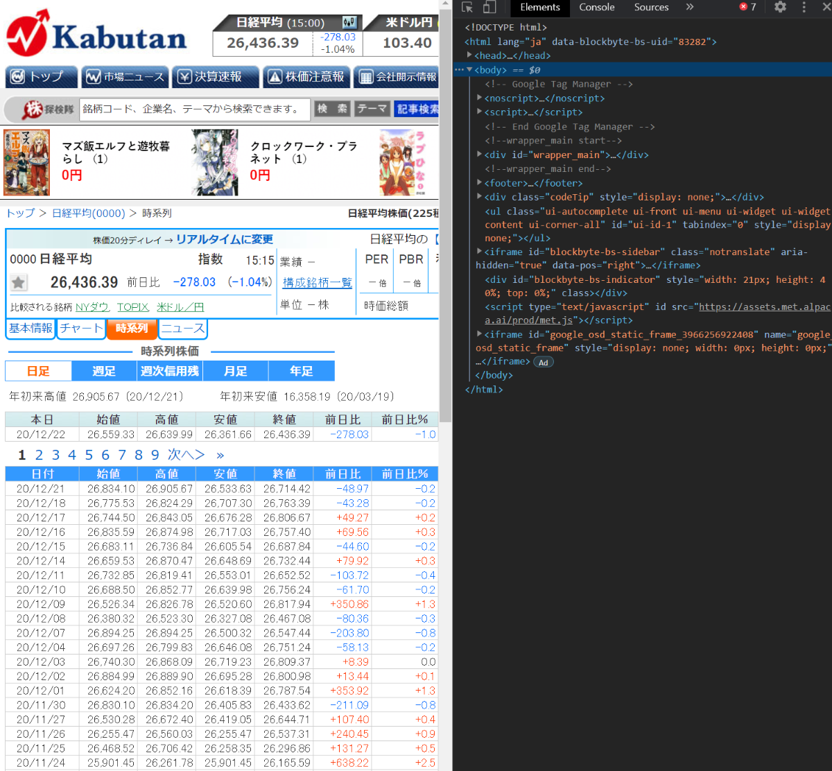 [F12]でChromeの開発ツールを開き、XPathをコピーしhtml_node(xpath = ここに張り付け)。今回株価を取得するために書籍の図2.5では開発ツール内の「< table class='stock・・・」の部分のxpathをコピーするということのようだが、見当たらず断念した。