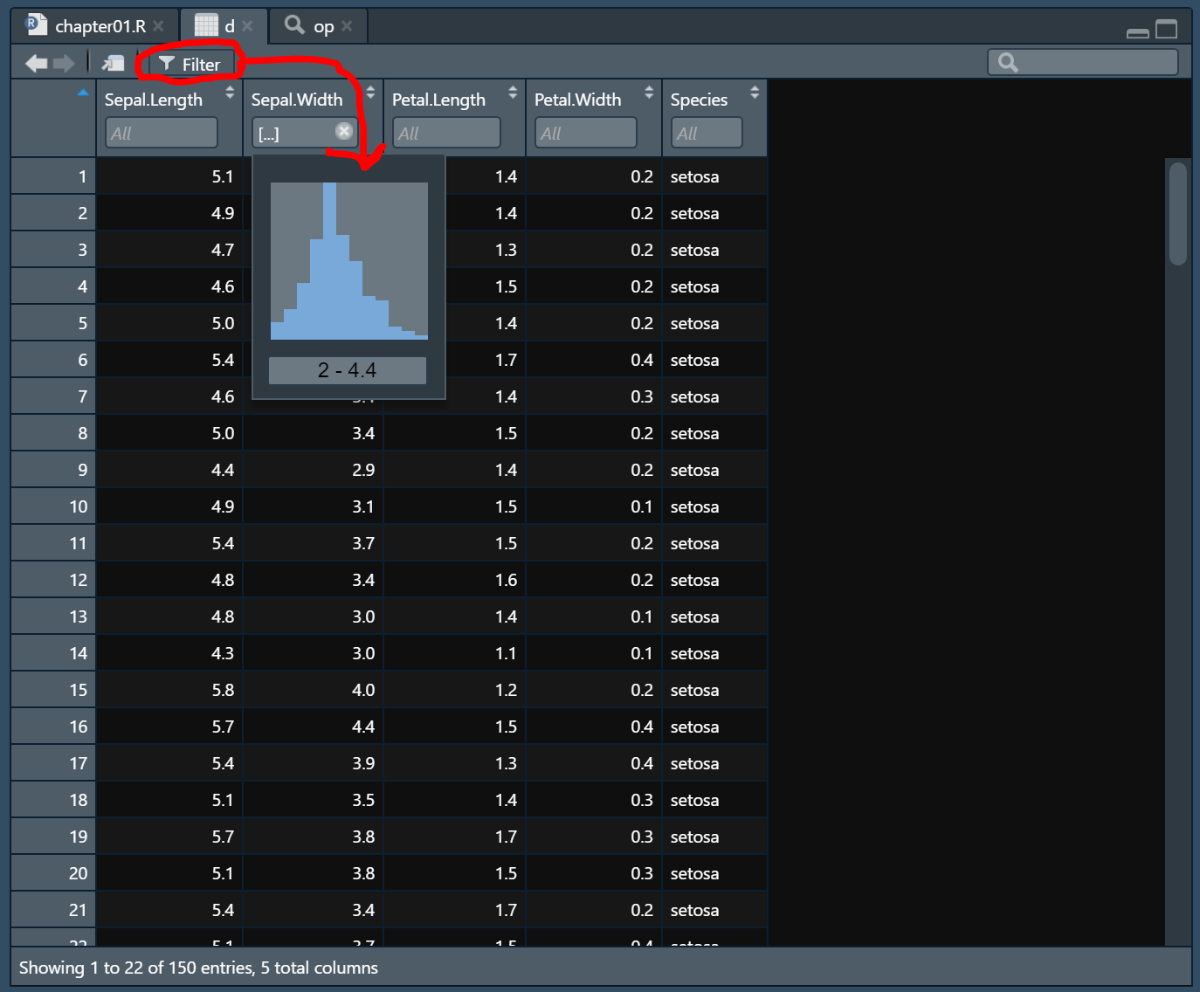 データフレームの中身の確認で「Filter」をクリックすることで列内の分布を大まかに把握可能。