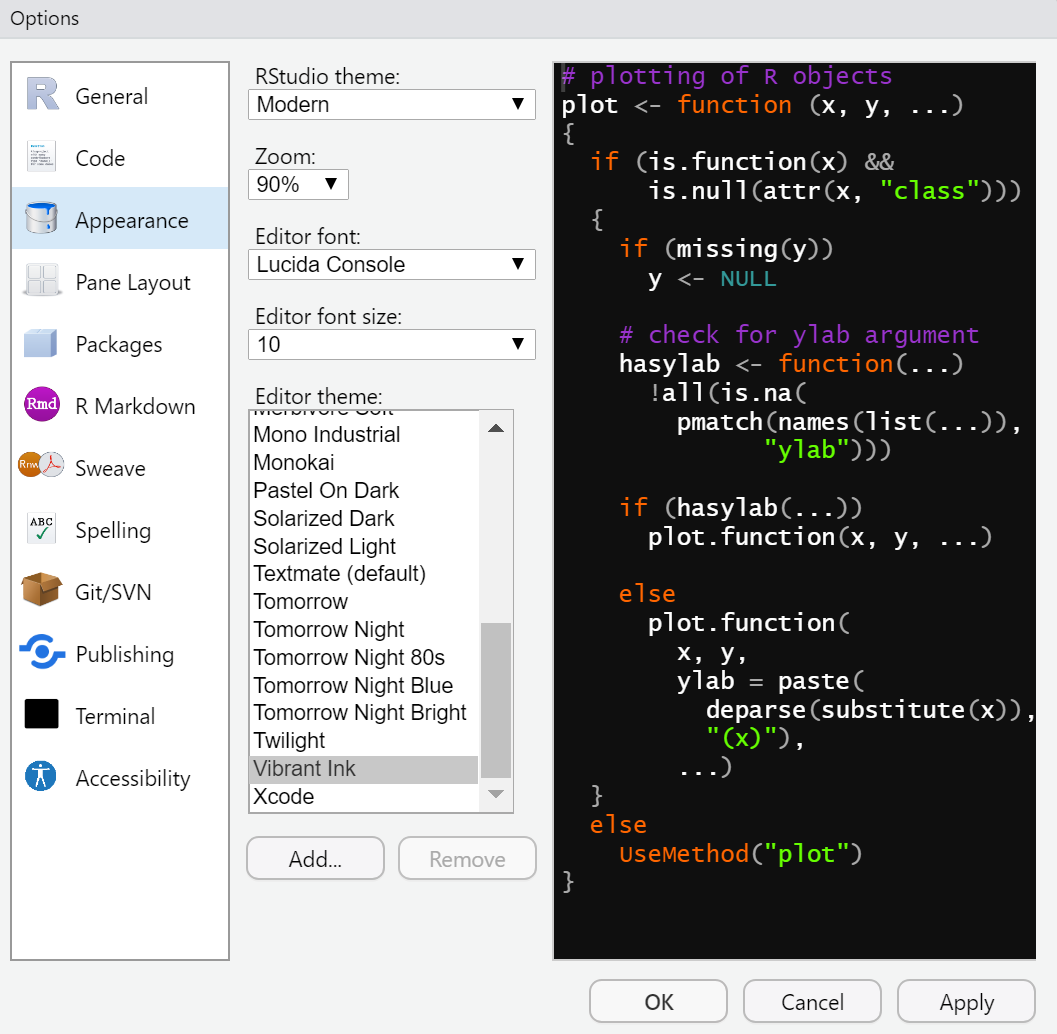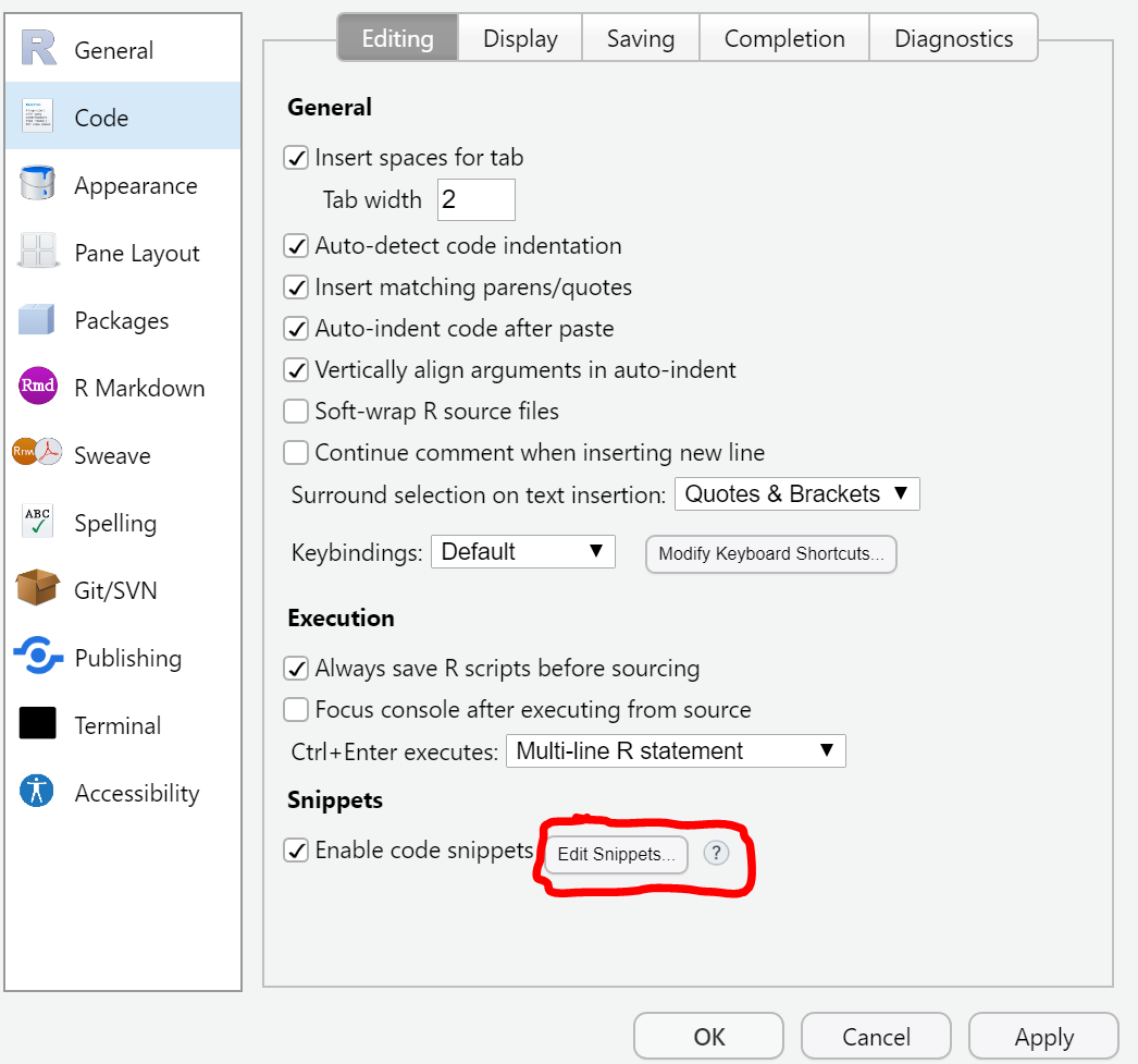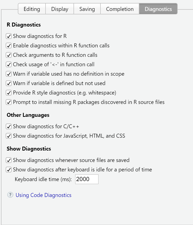 RStudioの設定。こだわらない人にとってはデフォルトのままでいいと思う。個人的に変えたところは、保管機能を開始する文字数を3から2に、きれいなコードを書くためにコード診断に関するDiagnosticsタブの項目をすべて有効にした。あとは外観を白だと目が疲れるため黒に。