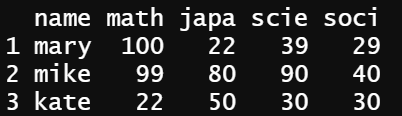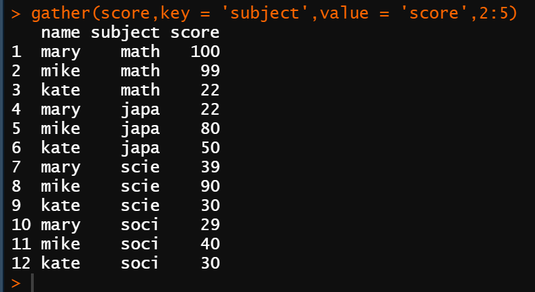 score.gather <- gather(score,key = 'subject',value = 'score',-1) ## 上と同じ