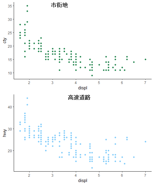 ggarrange(g1,g2,labels = c('市街地','高速道路'),nrow = 2,hjust = -3)