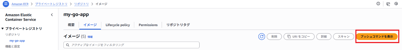 ECRリポジトリの画面右上にある「プッシュコマンドの表示」ボタンを押すと、あなた専用のコマンドが表示されます。それを順番に実行します。