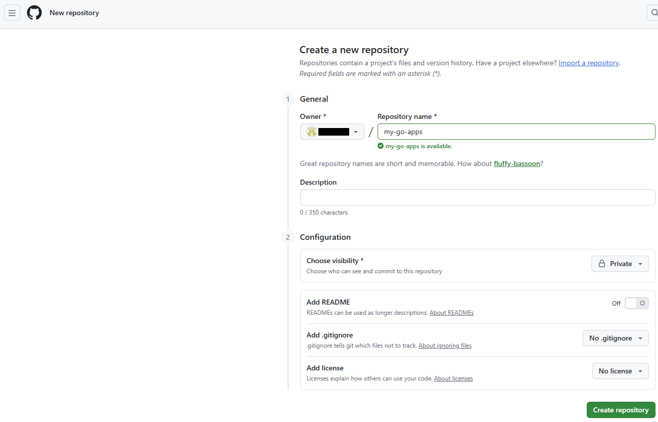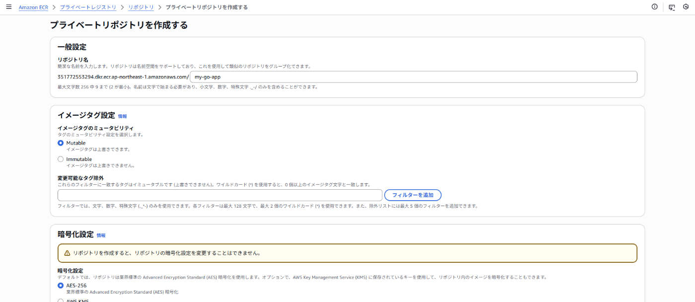 リポジトリ名:my-go-app と入力。