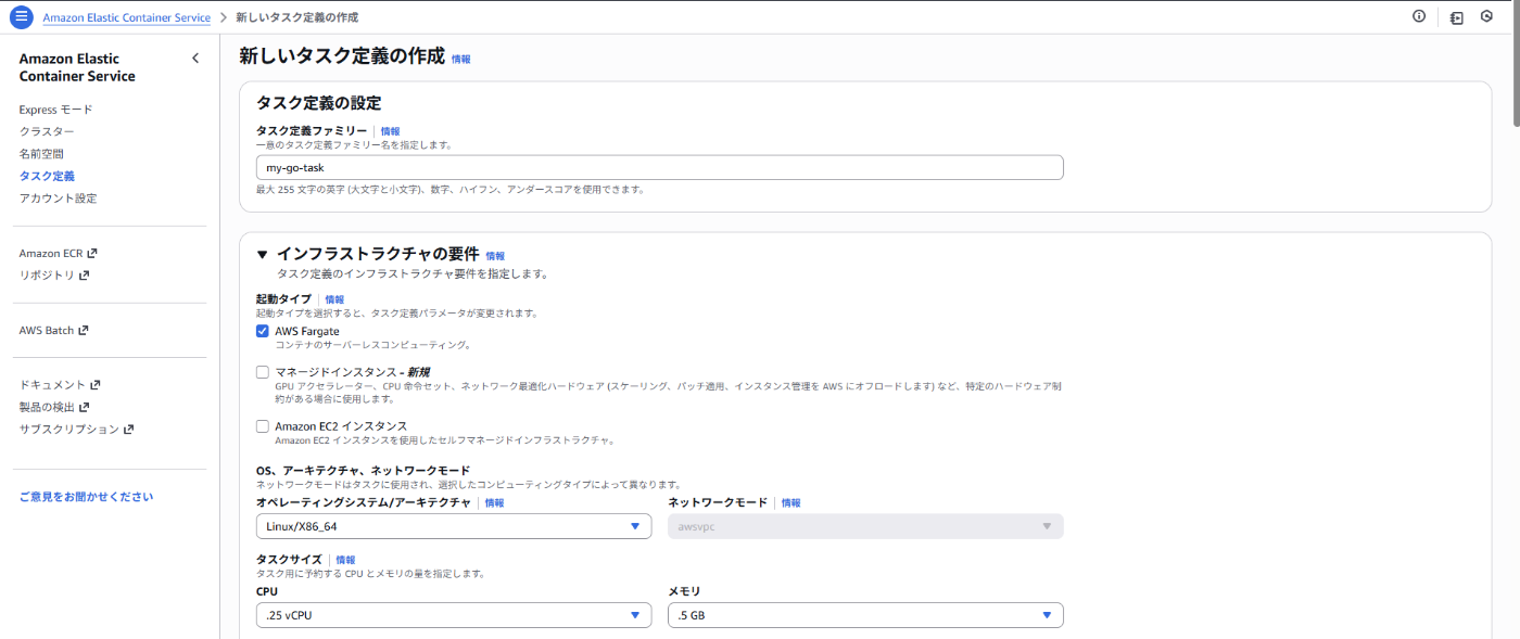 ECS_TASK_DEFINITION: my-go-task # タスク定義のファミリー名