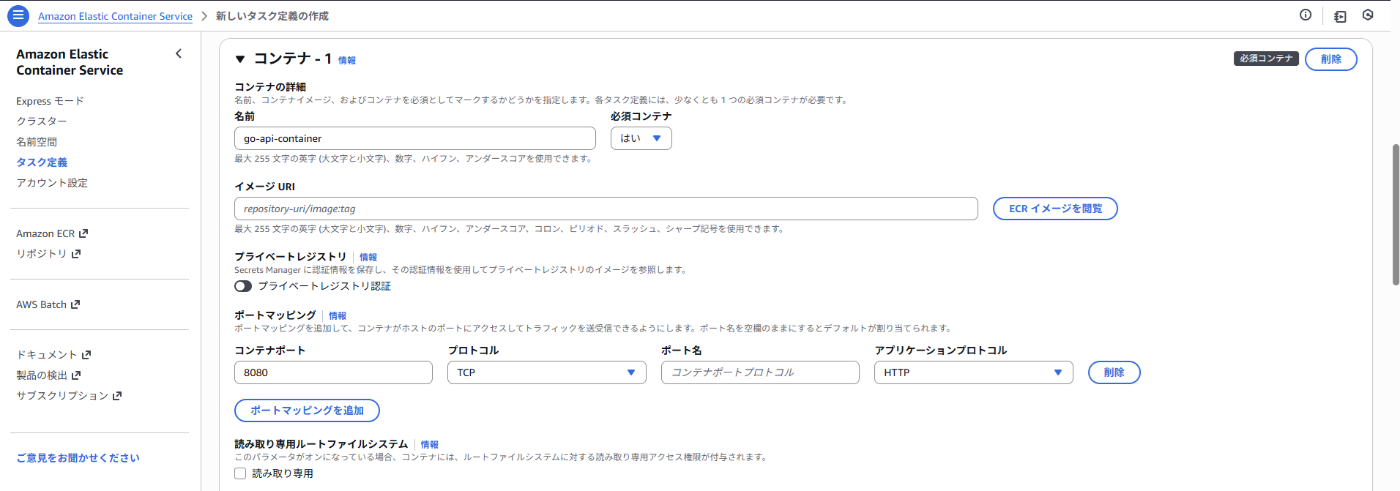 CONTAINER_NAME: go-api-container # コンテナ名(タスク定義内の名前)