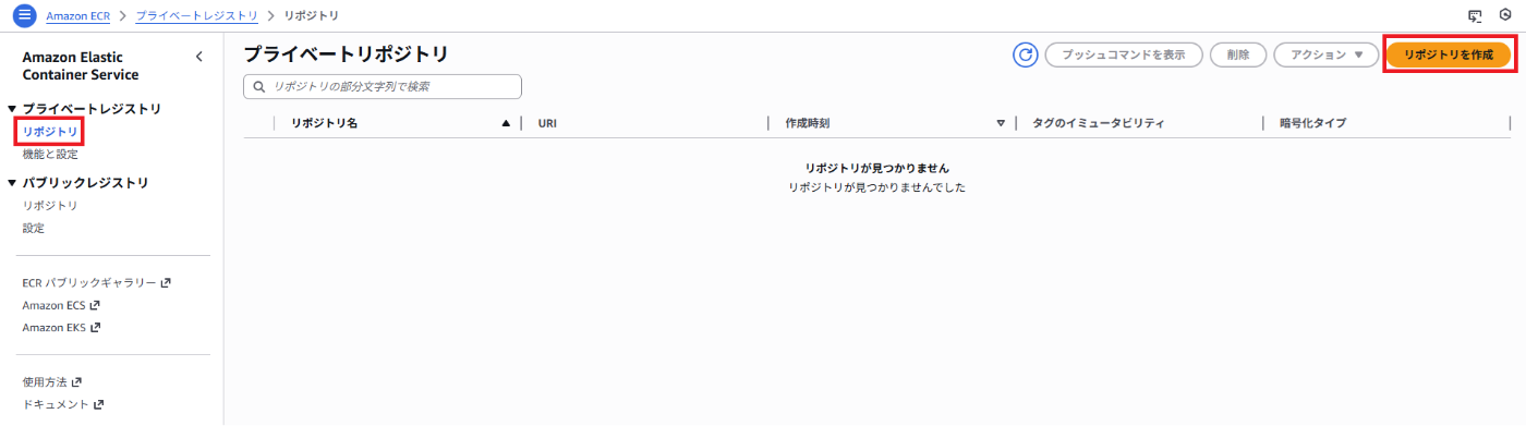 まずはAWSの管理画面上で、イメージを保管するためのリポジトリを作成します。AWSコンソールにログインし、検索窓に「ECR」と入力してサービスを開きます。左メニューの「プライベートリポジトリ」を選択し、「リポジトリを作成」をクリック。
