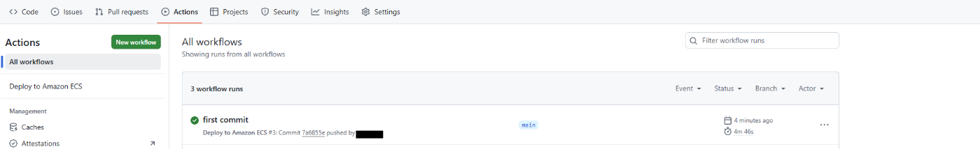 GitHub のリポジトリの「Actions」タブを見ると、デプロイが進行している様子が表示されます。すべて完了したら、ECSのサービス画面で新しいタスクが起動しているはずです。
