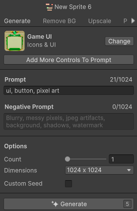Unity上部の AI -> Generate New -> Sprite を選択し、UIを作成したいので、