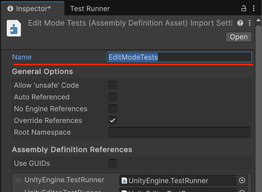 InternalsVisibleToに指定する文字列は、テストコードの.asmdefファイルに定義されているNameなので、下図のように.asmdefのInspectorで確認