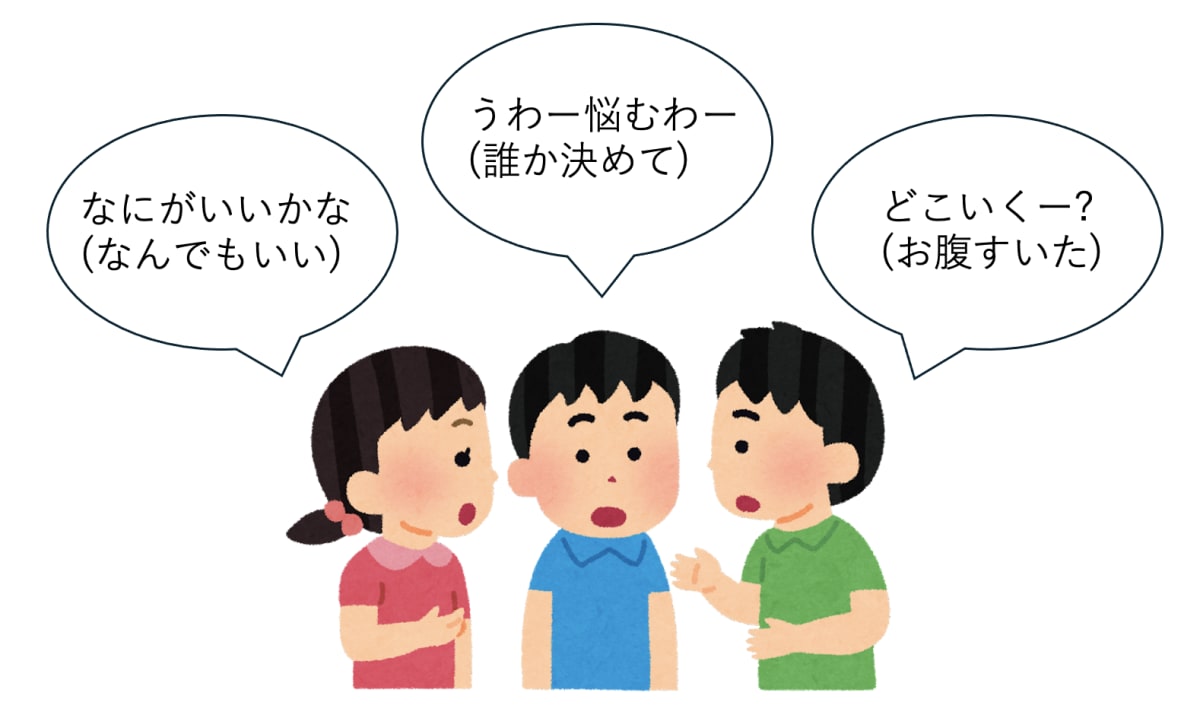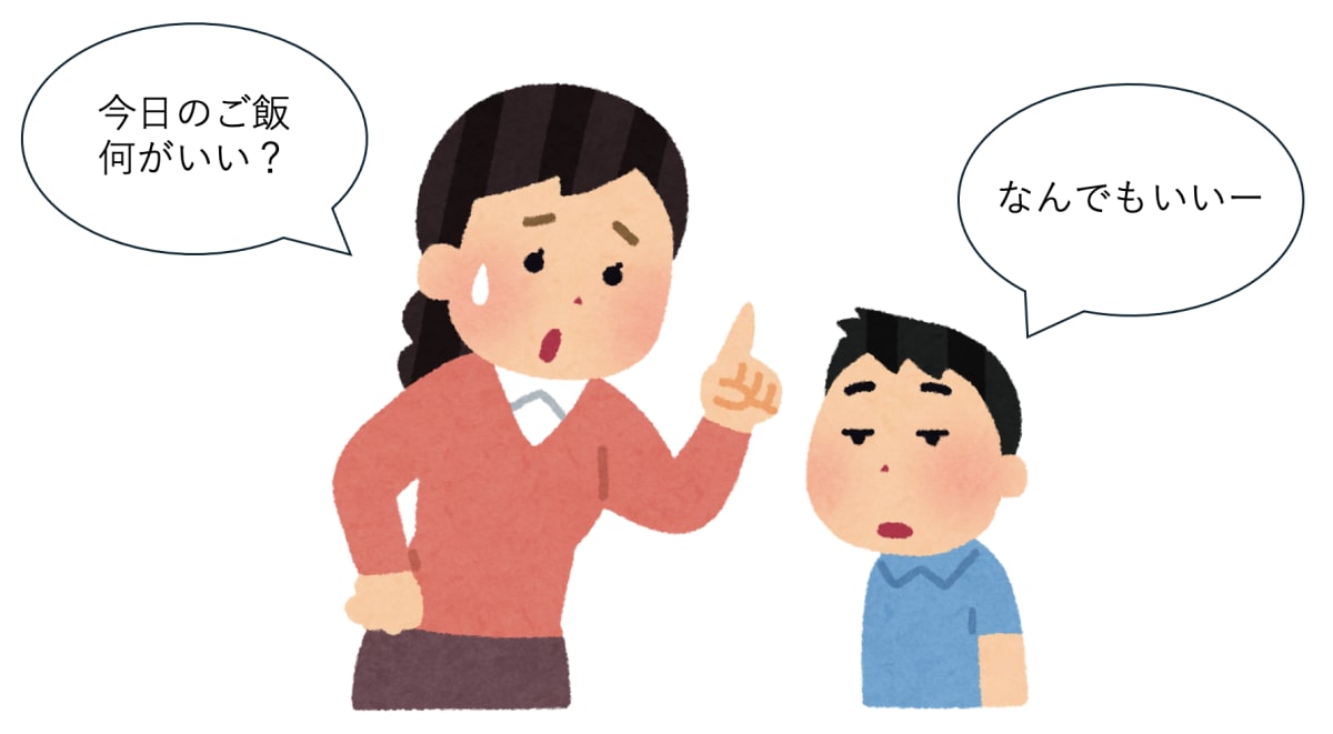 まず、先ほど述べたような状況がなぜ起こるのかについて考えたいと思います。お店が決まらない状況というのは、母親に「今日の夕飯何がいい?」と聞かれて困る現象によく似ています。なにがいいかと聞かれてもなかなか思いつかないです。