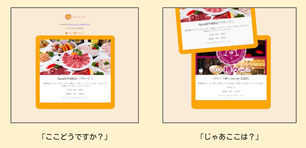 スワイプ操作ですぐに次のお店の候補が出てきます。