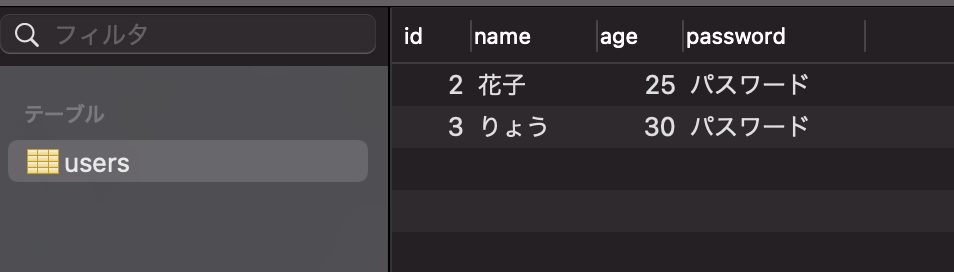 getAll [{1 太郎 20 パスワード} {2 花子 25 パスワード} {3 りょう 30 パスワード}]