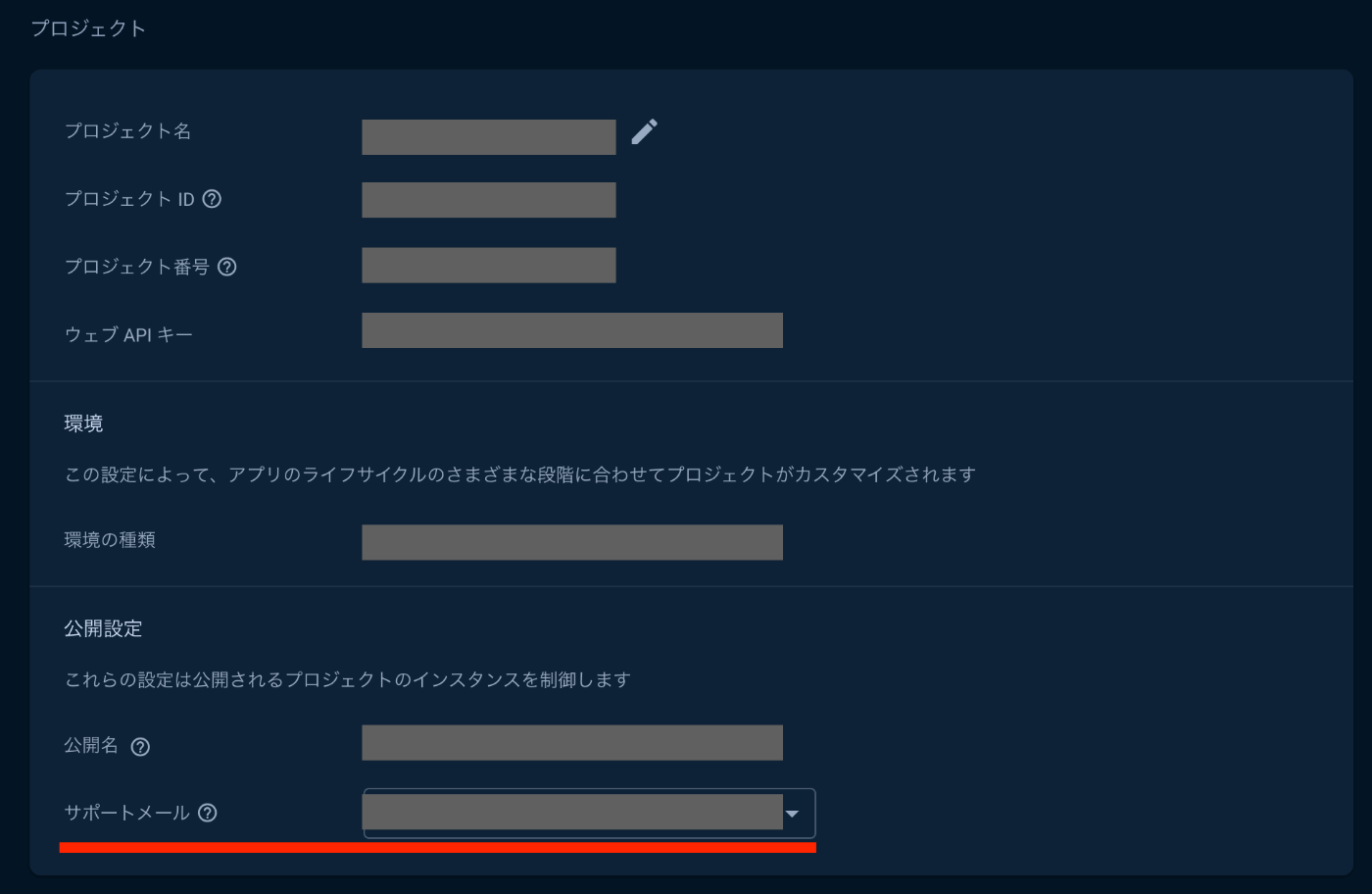 Firebase コンソールの「全般」>「プロジェクト」>「サポートメール」が登録されている必要があります。