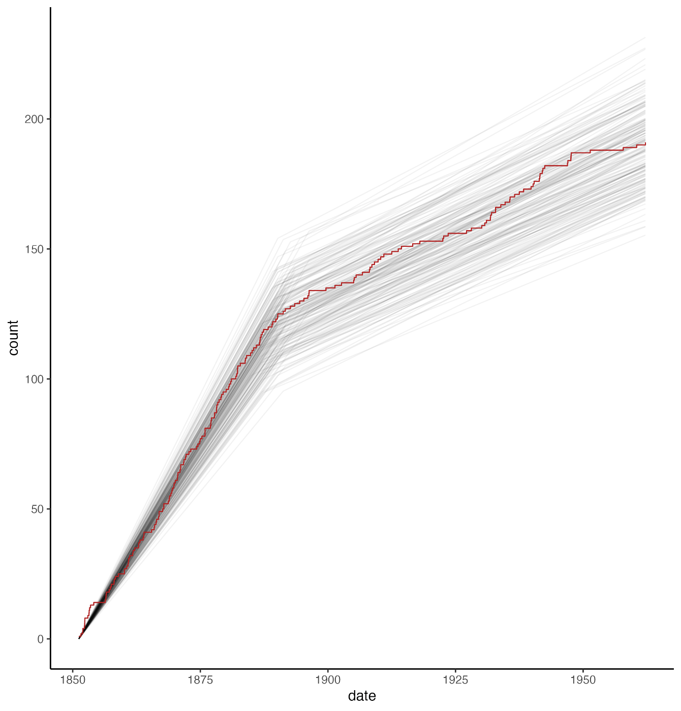 事故の累積発生回数をプロットしたもの: