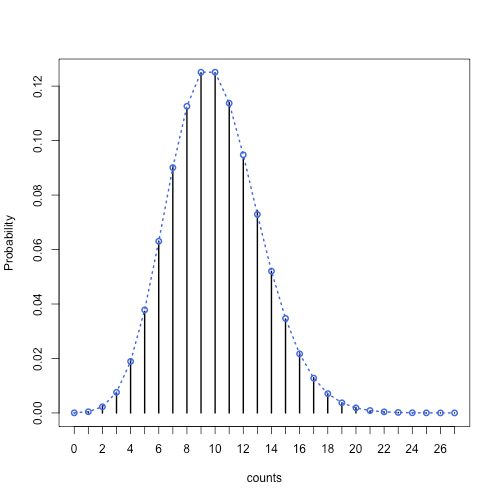 イベントの回数の分布.青いマーカーはポアソン分布の確率関数