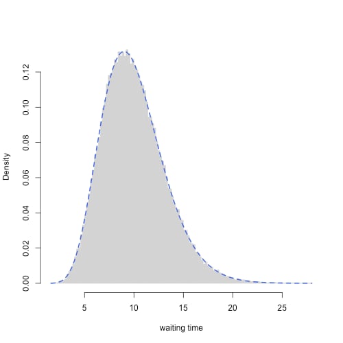 イベントの待ち時間の分布.青い点線はガンマ分布の密度関数