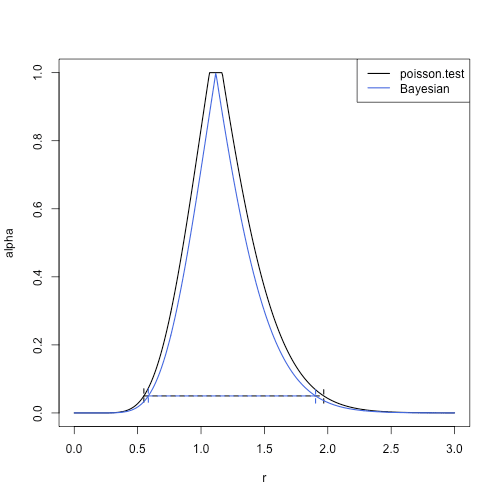 > res = poisson.test(x = k, T = tau, r = r, alternative = "two.sided")