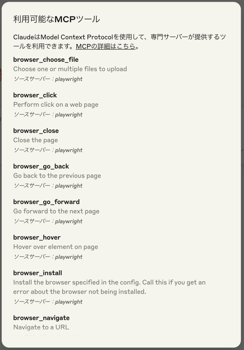 トンカチアイコンが表示され、アイコン押下でplaywrightの使用可能なツールがリストされます。