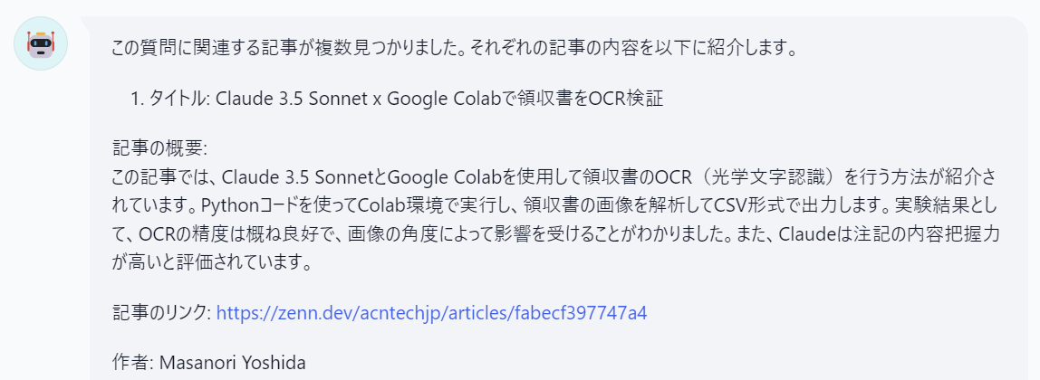ただ、「Zenn記事データ」がRAGの部分になるのですが、どのように作るか、チューニングするかが重要になってきます。