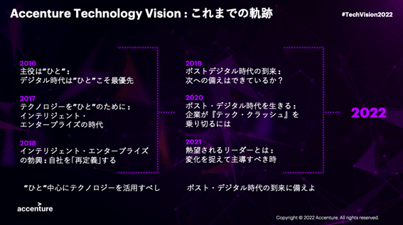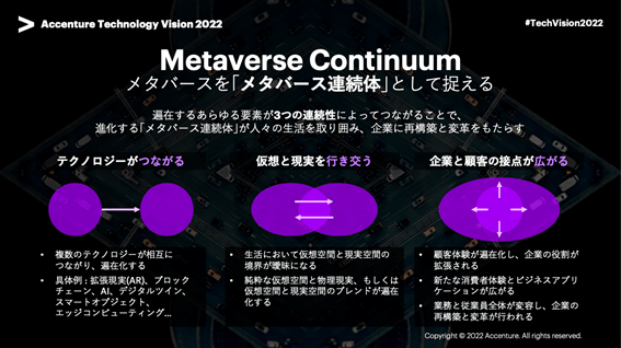 過去のテクノロジービジョンを振り返ると、およそ3年周期でひとつの大きなテーマが見て取れます。2016年から2018年までは、“ひと”を中心としたテクノロジ―。2019年から2021年は、ポスト・デジタル。そして、2022年のテクノロジービジョンは「メタバースで会いましょう:ビジネスを再創造するテクノロジーと体験の融合」です。