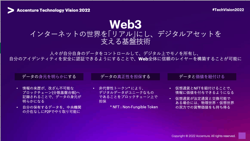 ここで重要になるテクノロジーはWeb3。Web3とは、インターネットの世界を「リアル」にし、デジタルアセットを支える基盤技術です。Web3の意義としては、ブロックチェーンによりデータの身元を明らかにすること、データの信頼性を担保すること、仮想通貨とトークンを紐付け、データと価値を紐付けること、一般的にこの3点で説明されています。