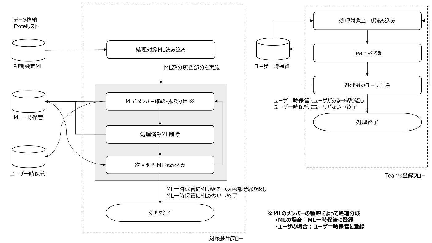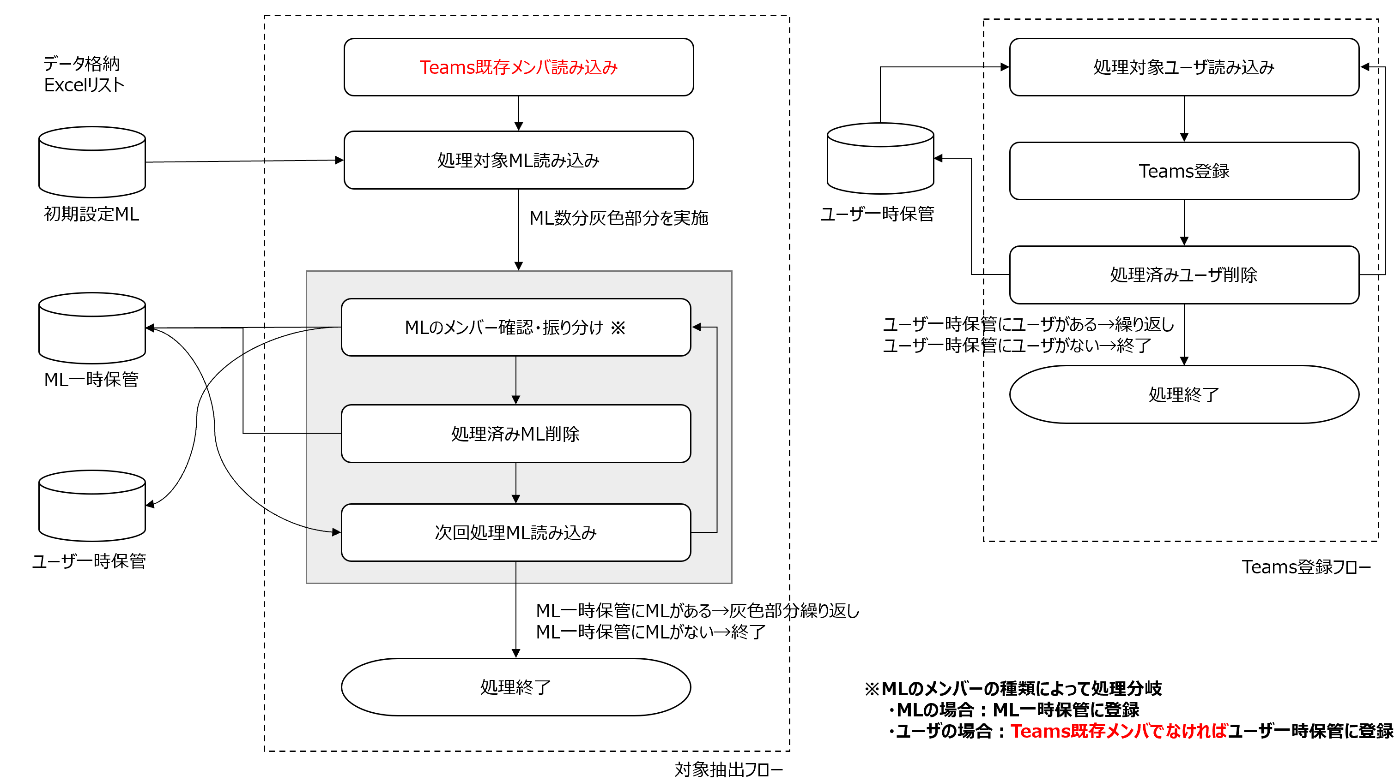 そこで既存メンバー情報を取得し、未登録のメンバーだけをTeamsに登録することにしました。これにより「あるMLを個人にばらすフロー」の処理時間が10分程度増えますが、全体では時間を短縮することができました。