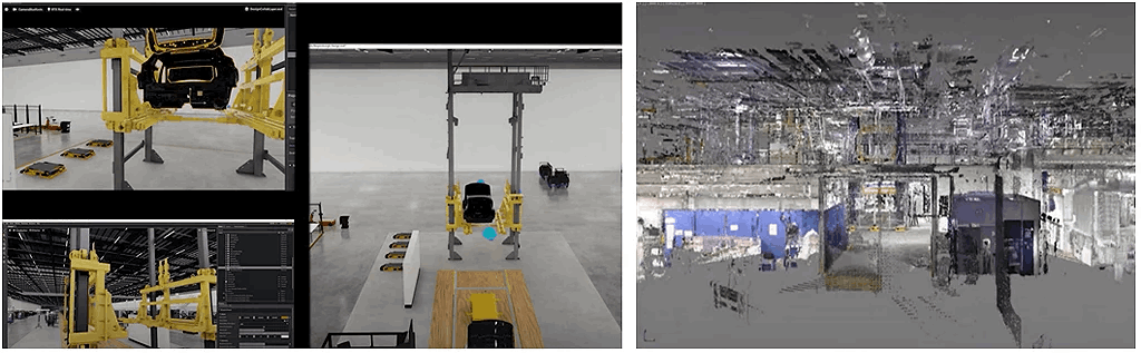 NVIDIA OmniverseとNVIDIA AIとを活用することで、新時代のデジタル自動車生産を実現しています。図2は、Omniverseによって実現された車両組み立てシステムのデジタルツインです。