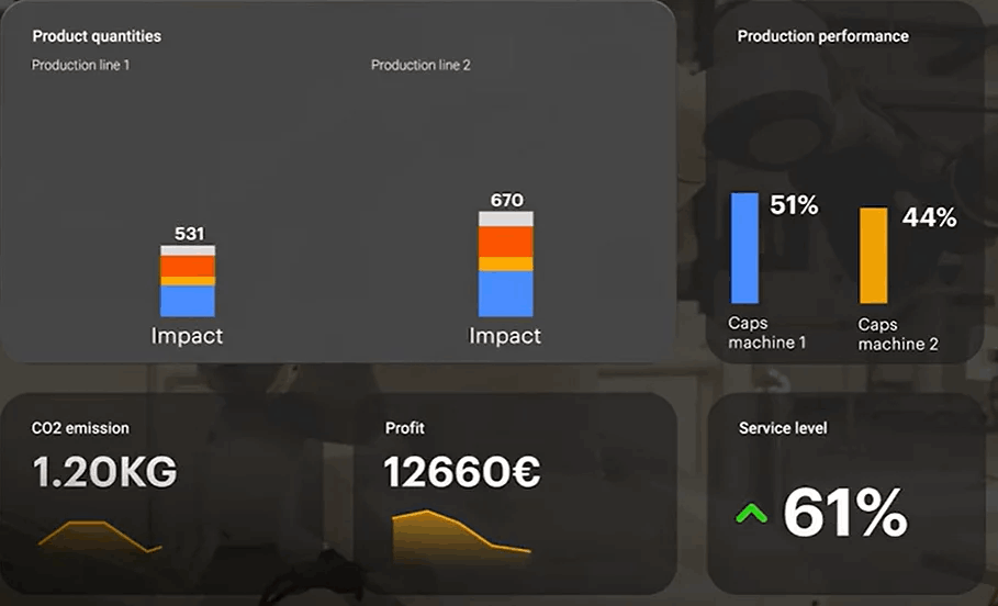 実物のラインはより効率的で汚染も少なく、主に収益性の高いアラビカ種のキャップを生産しています。最初に、工場を調整するためのインタラクティブなコントロールタワーを作りました。すべてのITシステムを統括し、データはそこから抽出され、環境に応じて意味づけされた形で提示されます。オペレーターはダッシュボードでKPIを監視でき、問題が発生した場合は警告が表示されます。意思決定を支援するシステムによってオペレーターが適切な判断を行い、問題の影響を最小限に抑えることができます。
