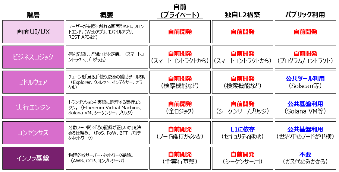 | 項目 | ① 自前(プライベート) | ② 独自L2構築 | ③ パブリック利用 |